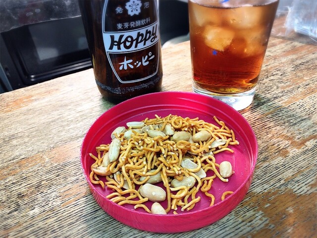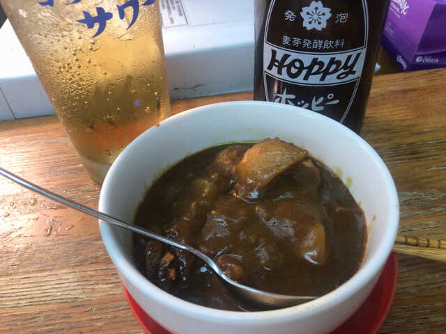 豊田屋にいった帰りに覗いたら今宵は密ではなかったので二軒目に利用させてもらいました。ホッピーセットはデフォルト焼酎1合にて、ほろ酔いのおっさんには十分な酒量でございます。当店の2大メニューはナポリタンとじゃがカレーと勝手に思っていますが、私はナポリ派なのでホッピーを飲みながらパスタをちまちまと口に運びます。今日は「(タバスコ)かけ過ぎると禿げるよ~」コールが無かったのは少し残念でしたが、マスターとの信頼関係は築けていると思います。ナポリを食べ終えて少々スナック類が欲しくなってかっぱえびせんを追加、これまた少量なのが箸休めにちょうど良い感じです。まだお腹に余力がありましたので久しぶりにカレーも食べてしまいました。ちょいと辛めでスパイシーで酒が進みますね。常連さんとマスターの掛け合いをBGMに心地よく過ごしました。ごちそうさまでした.