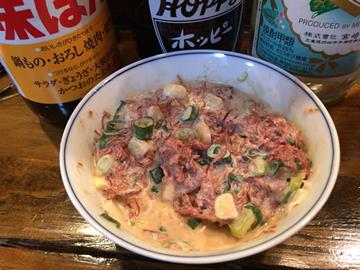 コンビーフにマヨネーズとネギが載った食べ物がポン酢と一緒に出てきました。