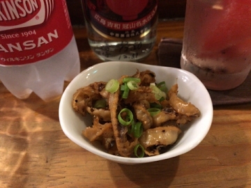 ちょっとお肉が欲しくなって、「とりハツと皮のしぐれ煮」を注文、生姜が効いててちびちび飲むのによいですね。ちびちびというよりホッピーがグビグビって表現が正しいですかね。喉が渇いてきたのでポン酢セットに移行しましょう(ポン酢+炭酸)