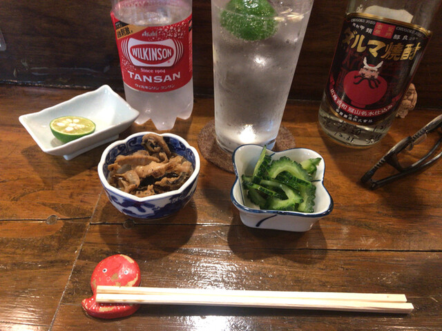先客お二人くらいで、まったりと飲みをスタートしました。ちょっとスッキリしたくて名物のぽん酢サワー!酸味が鼻にツーッときて目が覚めます(笑)。お通しはほうれん草と雑魚の和え物でした。その後はキープしてるキンミヤを出してもらって黒ホッピー、アテはメニューから発見した100円の納豆、店主曰くさとしからパクったらしいです!?その流れから同店の青椒肉絲は旨いとか、つけ麺のニンニクがガッツリくるとか常連さんも交えて情報交換しました。