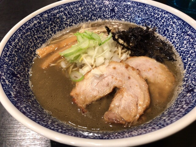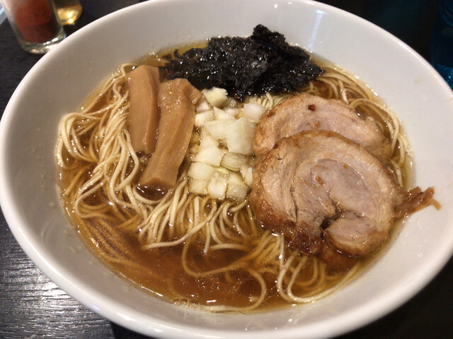 ・具材はバラ巻きチャーシューと刻みタマネギ、岩海苔、メンマ、という厳選されたメンバー。タマネギは魚介出汁に合うし、岩海苔もこういったシンプルスープに映えまくり。チャーシューは相変わらず毎回フライパンで温めて出してくれるので脂身が固まらず美味しく頂ける。