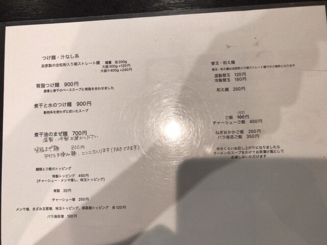 ・スープは相変わらず煮干しの旨味主体のサッパリしたタイプ。でも背脂のせいでパンチもあります。新メニュー表初めて見て知りましたが、豚骨も使ってたんですね〜。