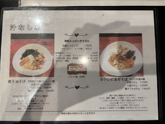 週末のランチで訪問、久々に煮干しと水だけのらーめんを頂きました。限定のスキヤキ和え麺¥400をどうしても食べたかったので店主様にお願いしてトッピングでボリューム調整。「かけ(刻み玉ねぎのみ)」を選んでバラ海苔をトッピング。