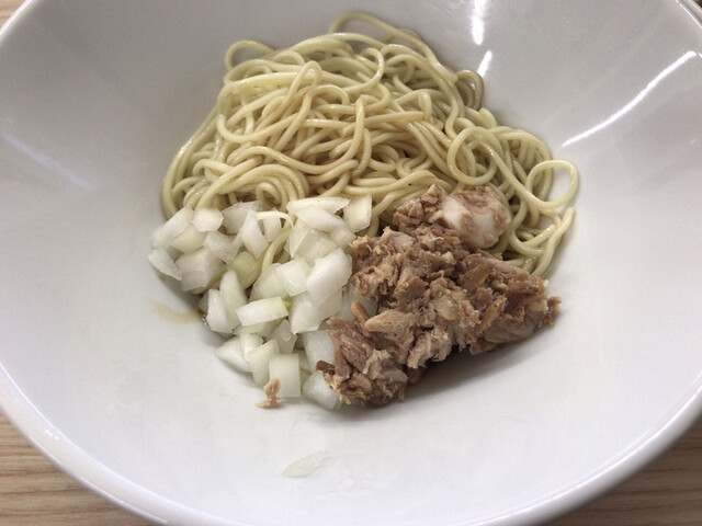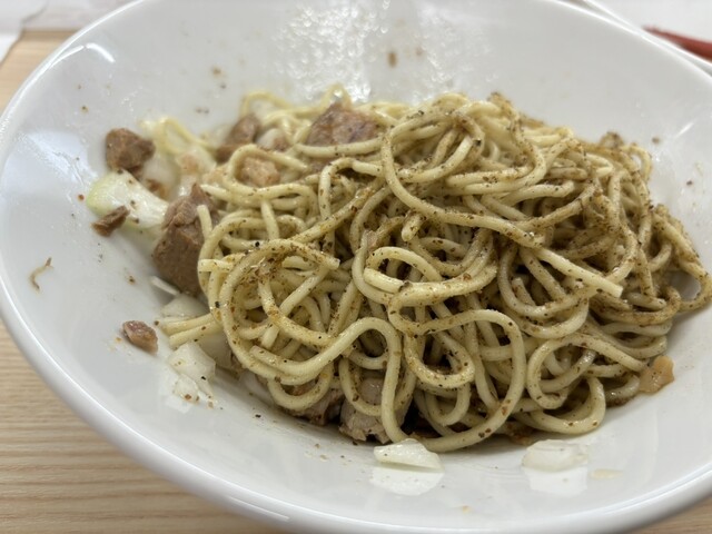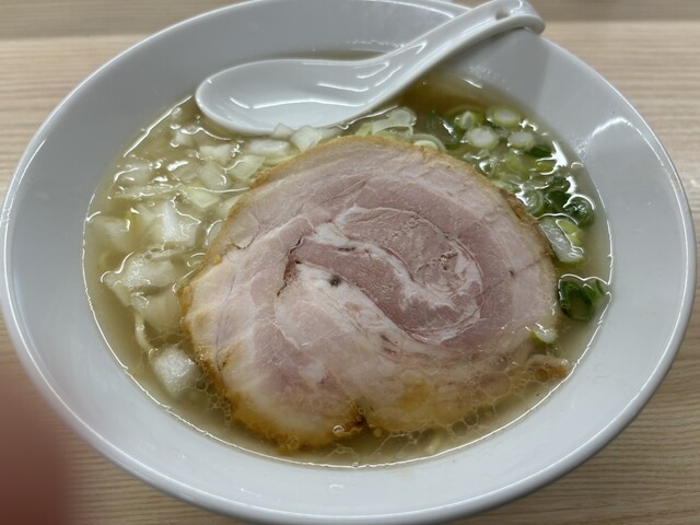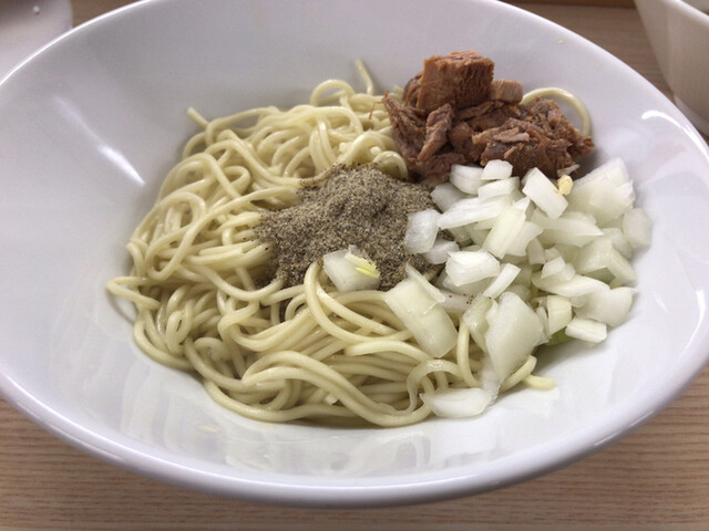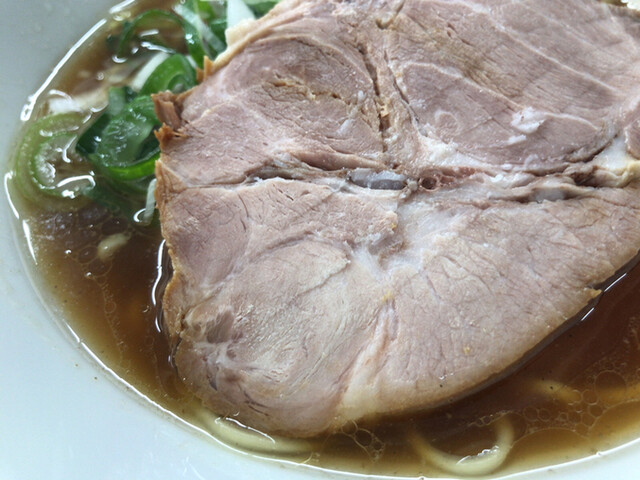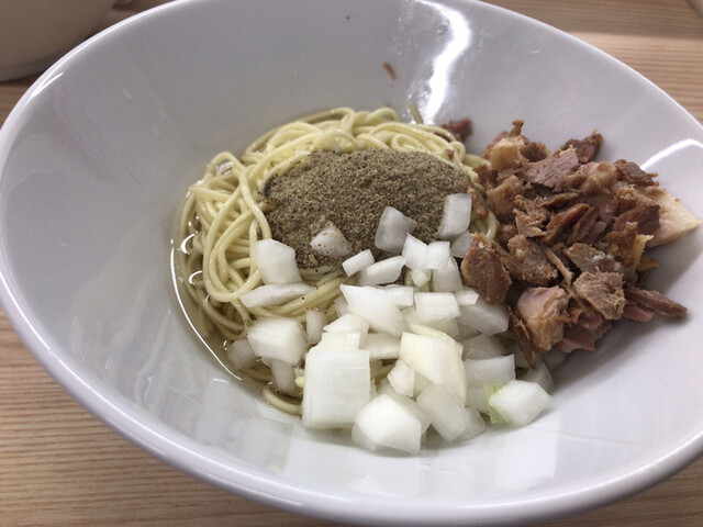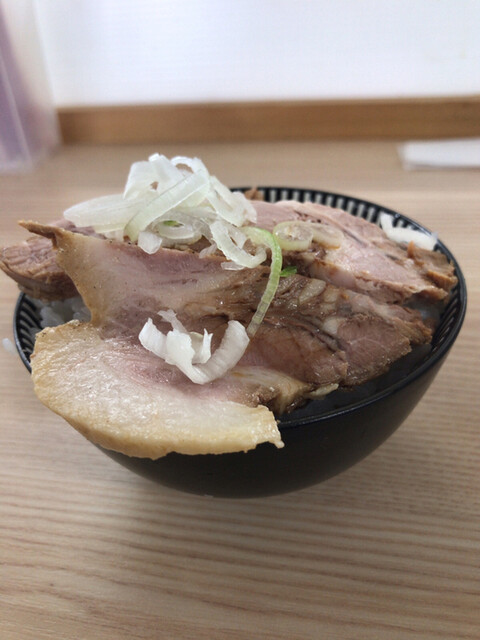 ・トッピングは他メニューとほぼほぼ共通で巨大チャーシューと玉ねぎざく切り、青ネギ、です。