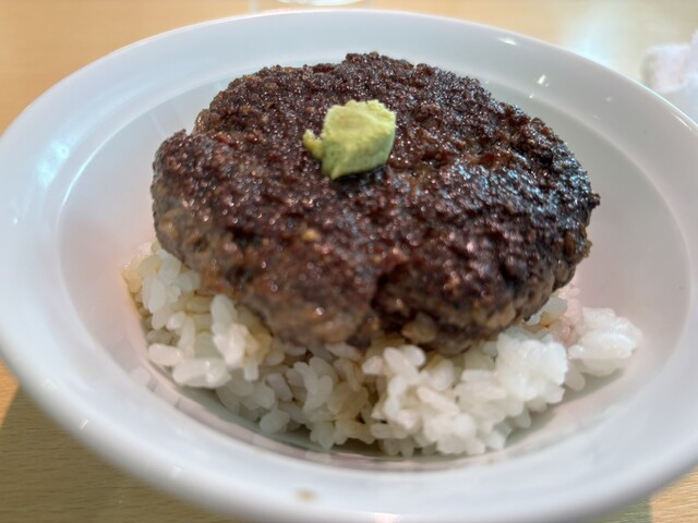・ハンバーグは外がカリッと焼かれて香ばしく中はレア。赤身肉のピュアな旨みを楽しめます。甘塩っぱい醤油ベースのステーキソースが王道で合います。最後は少し残してスープをかけ回し茶漬け風に楽しむのが好きです。鴨と牛の旨みが合わさって気絶しそう。