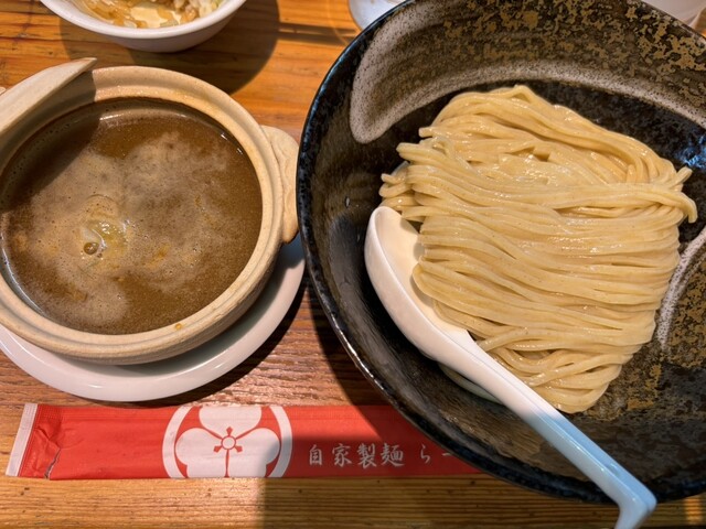・専用麺は中太に近い太さでツルモチ。あつもり仕様で熱々のつけ汁と相まって最後までぬるくならずに楽しめる。熱々ってらーめんの重要な要素なんだけど、コレを真剣にやれてるお店って意外に多くないことに最近気づきました。