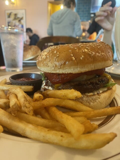 グランドメニューをなかなか食べられないけど、クラシックチーズバーガーも大好きです。ピクルスが贅沢。
