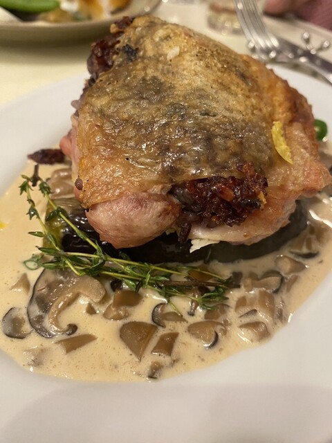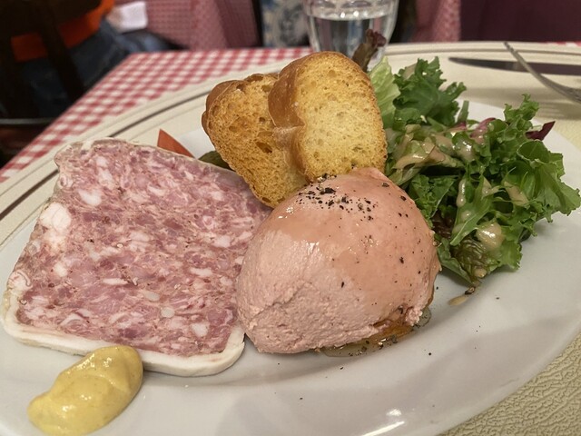 パテ盛りの前菜とチキンの古代米が埋まってるグリル。