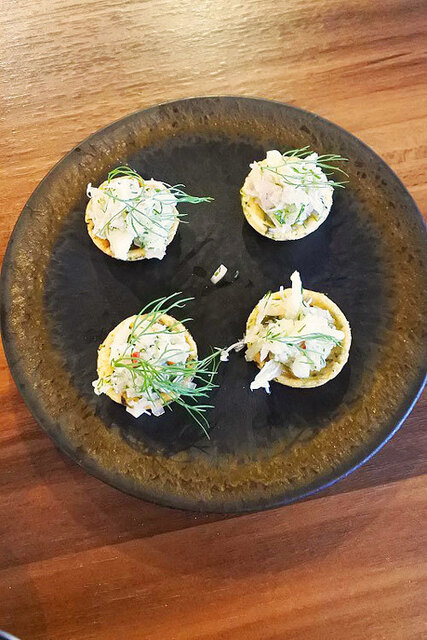 この日の「お通し」は「カニとアオサのカナッペ」(?)!!手作り「クラッカー」がサクサクで美味しい!!