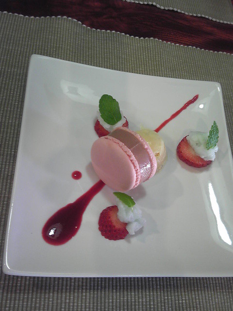 パスタの説明は必要ないでしょう、今月のデザートはフレーズフランボワーズのマカロンに牛乳とラズベリーのジェラートを添えたものでした。