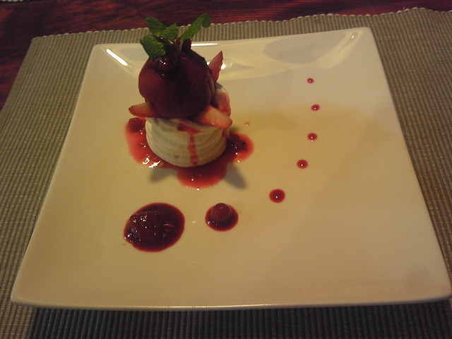 デザートはメレンゲを焼いた器にカスタードクリームを詰めカシスのジェラートを載せたものでした。