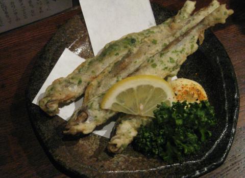 4本のししゃもを青海苔入り衣で揚げたもの。