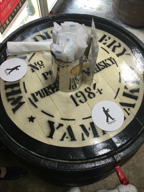 お店に入ると、樽のテーブルにスタンディングで待ちます。