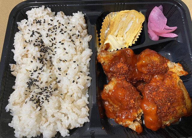 『辛いのが好きな方にオススメ。韓国のヤムニョムチキンの様な唐揚げ。お弁当の場合は、+50円で赤唐揚げに変更できます。是非ぜひこの機会に食べてみて下さい』との事。