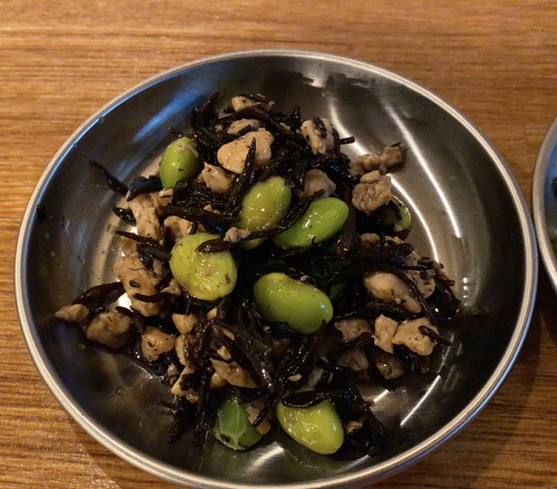 豆腐、ひじき、枝豆を甘めの出汁で和えてあるんですがオツマミでもご飯のお供にも合う味付けで最高でした。