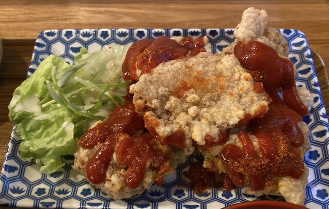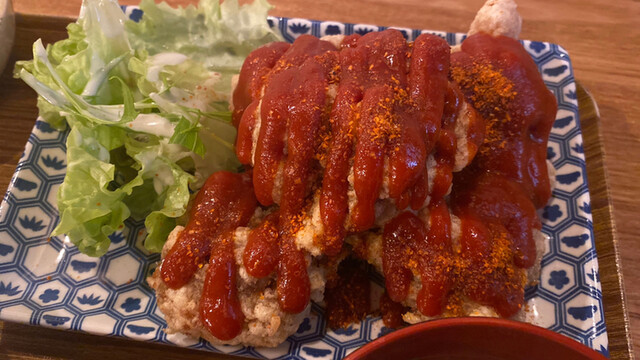 唐揚げに旨辛なタレが掛かっています。