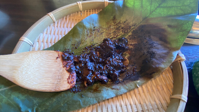 途中から出される朴葉味噌(上にはネギと椎茸)