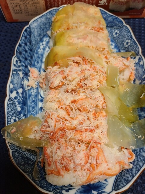 酢飯が美味しくて甘酢の加減が絶妙。蟹の身がたっぷりで薄い昆布との相性が抜群。大変美味しく頂きました。難を言えば切り分けがむずかしいこと。よく切れる出刃包丁でないとキレイに切れません。最初から切れ目が入っていたらより食べやすいと思いますが…