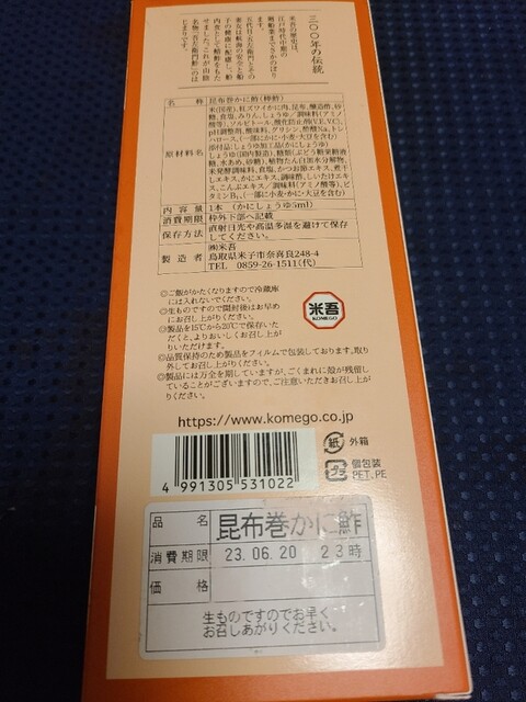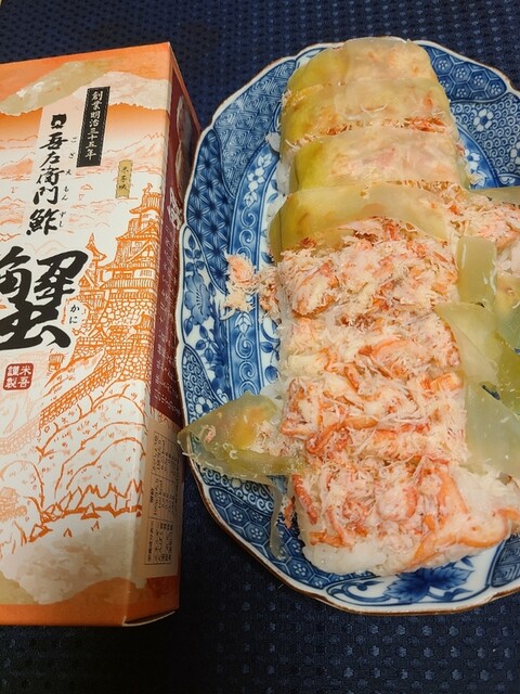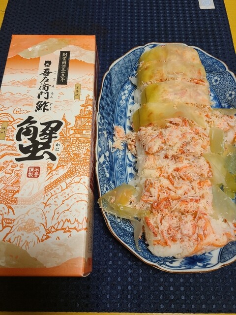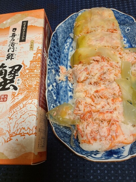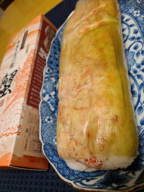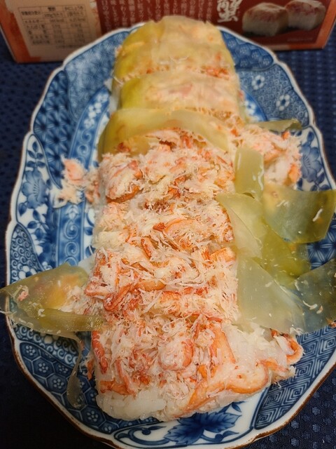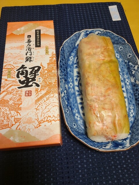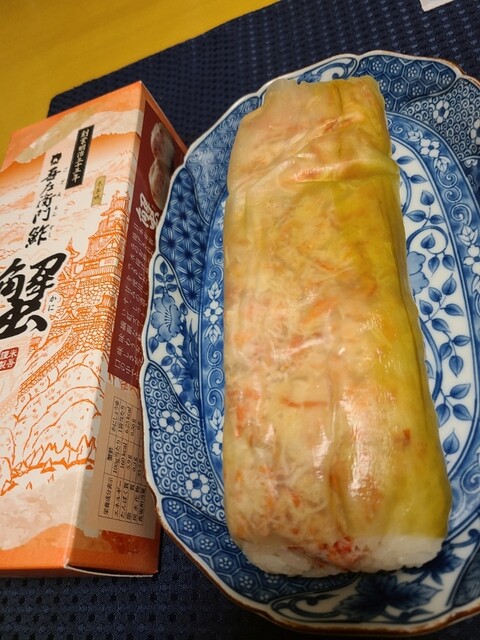 米吾の昆布巻き鯖寿しが好きでよく買い求めるのですが今回初めて昆布巻き蟹鮓を買って食べてみました。