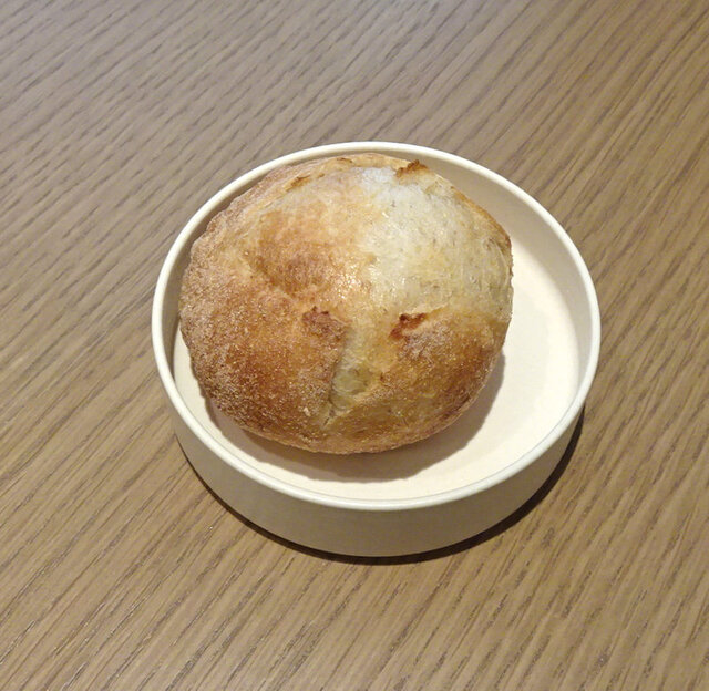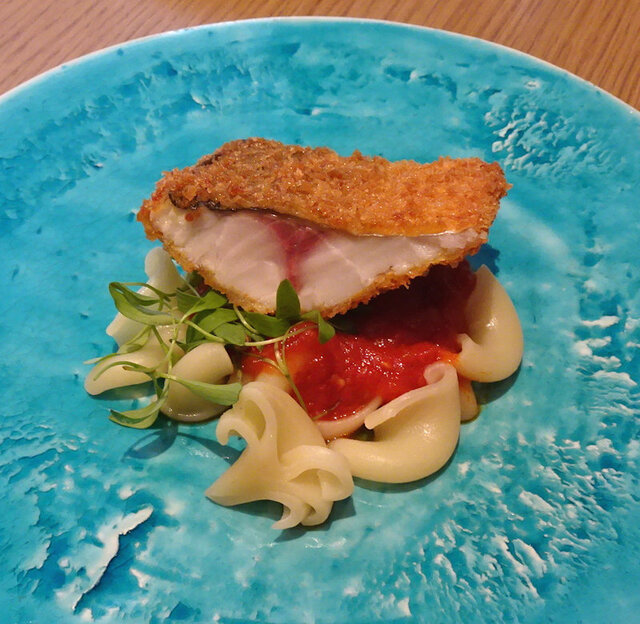 トマトベースのソースとマイクロパクチー、シェルマカロニを合わせた洋風のアジフライ。きめ細かく薄い衣は、旨味やスパイスをきかせた複雑でしっかりした味つけ。肉厚なアジの身は、見事な火入れで断面が美しい。口にすると、柔らかく旨味豊かでジューシー。別添えのニンニクビネガーのソースをかけると、甘味と酸味が混じり合った旨味で味変する。