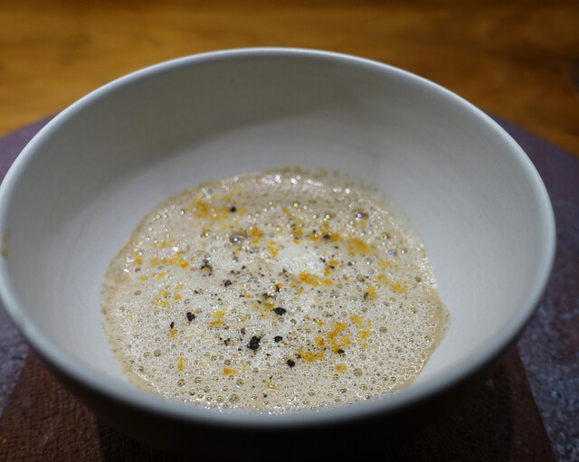 アミューズ・グール、オードブル(前菜)と続き、驚いたのがポタージュ。「ミカン畑のヒヨドリを骨まで潰してスープにしました」 ミカンの皮をすり下ろしたものも入って美味しいのですが、ヒヨドリの姿がちらついてやや複雑な心境に。