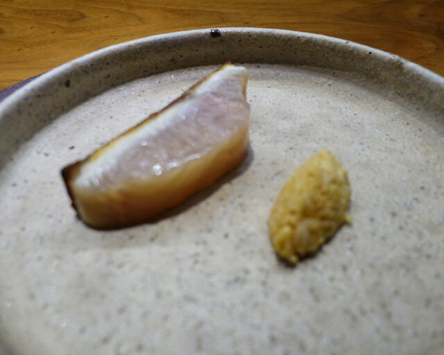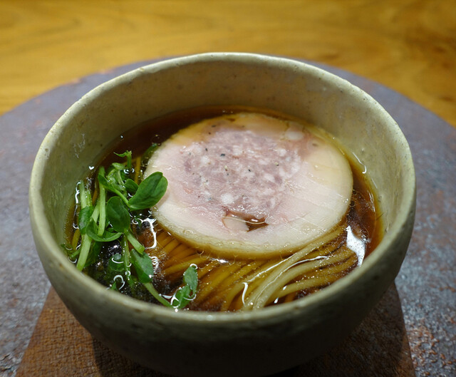 コース最後で供されるジビエ・ラーメン。魚醤は聞いたことがありますが、"肉醤"は初耳です。ストレート細麺の醤油系で供されるのですが、口の中が醤油ラーメンになり、私はかなり違和感を覚えました。ジビエの醤を味わってほしい店主の想いは分かりますが、言われなければ、ジビエをまったく感じられないパンチを欠いたラーメンでした。