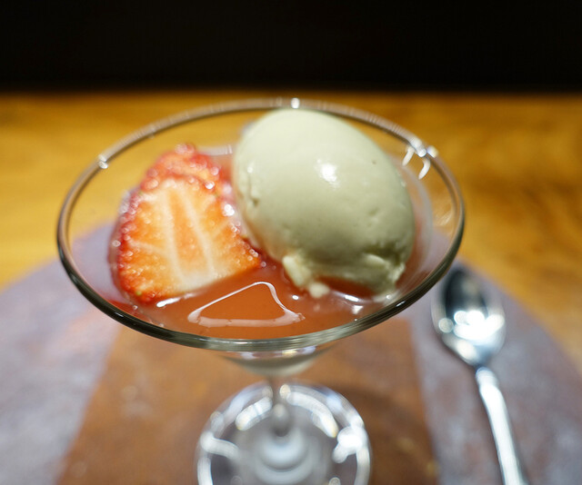 ①酒粕のブランマンジェに焼きナスのアイス、イチゴ添え