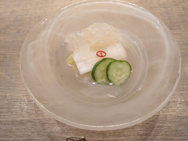 一番出汁にリブ巻きの細切りを素麺に見立て粘りの有る野菜で出汁との絡みを良くした『リブ巻きの肉素麺 大和芋とオクラ』
