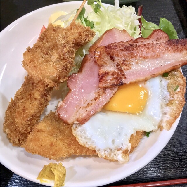 盛り合わせ(鯛のフライ、串カツ、ベーコンエッグ)定食。¥850。