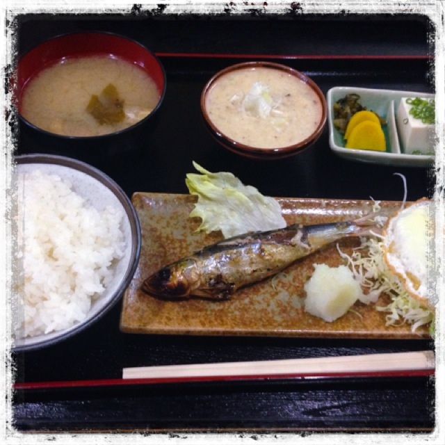 お昼の定食。自然薯(みそ)&鯵。¥800。