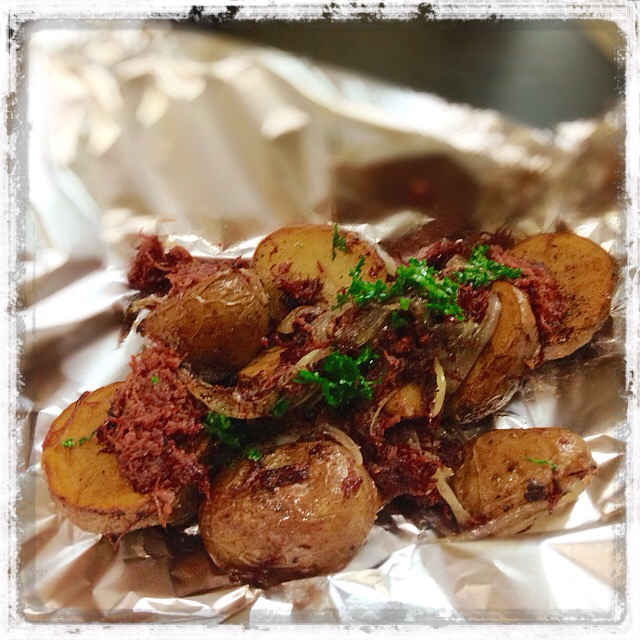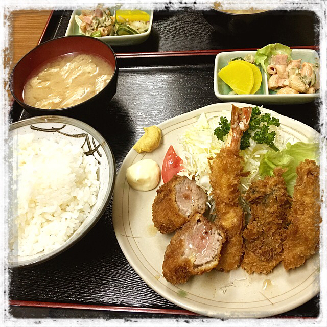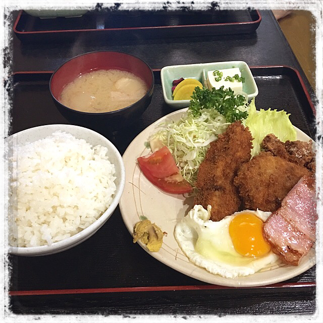 お昼の定食。串カツ、ひしこ鰯の唐揚げ、ミートソース。¥800。