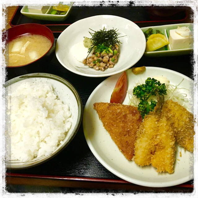 お昼の定食。穴子の1本フライ&ブリ納豆。付け合わせがニラのおひたしだったり、一味違う。