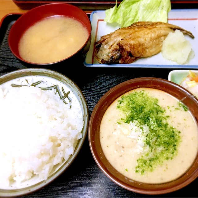 お昼の自然薯、焼き魚、目玉焼き定食。