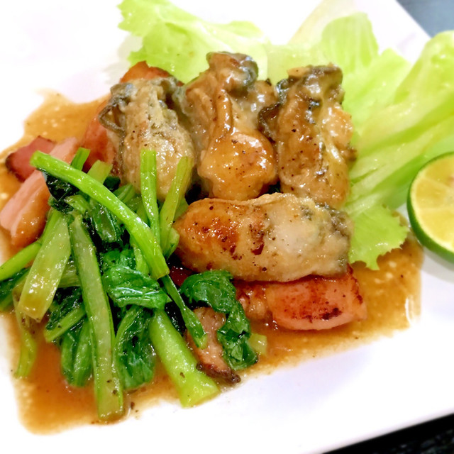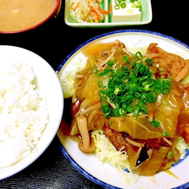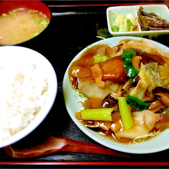 お昼の天然ブリと鶏の揚げ物、五目あんかけ定食。¥800。