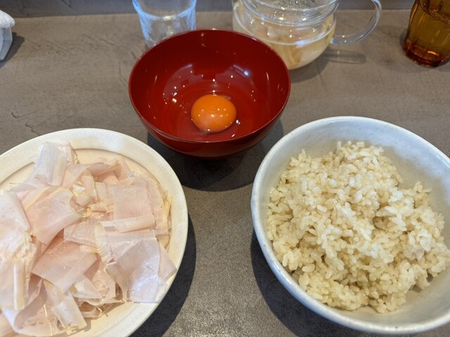 ごはんセット1800円(前菜3種)で、まぐろ節の卵かけご飯800円を注文。汁物は、選べる昆布。