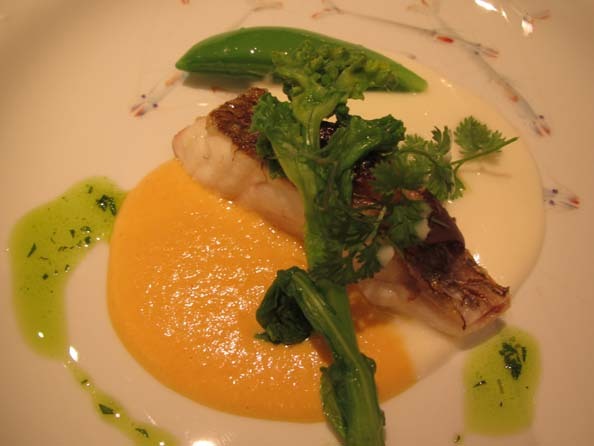 ハタの炭火焼き、カブ、海老の2種類のソース。