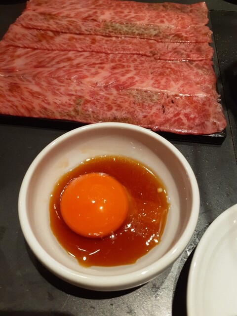 部位ザブトンを薄切りにして特製のにんにくダレに卵黄をからめて頂きます