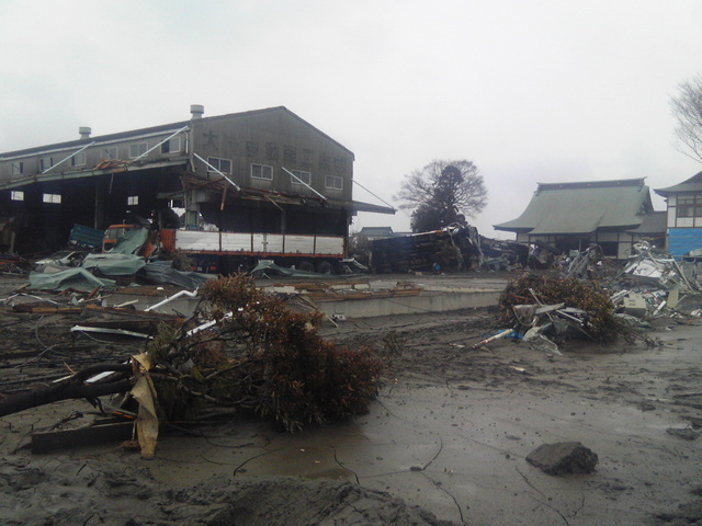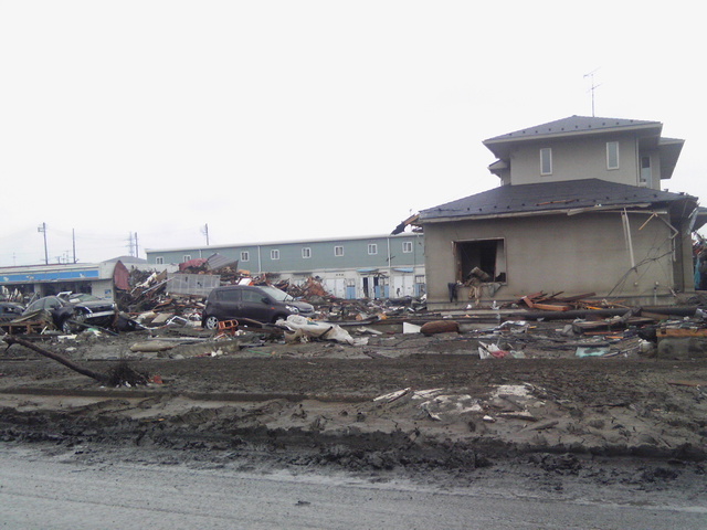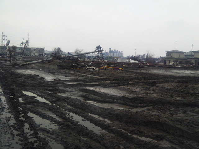親戚宅も全然見当たりません。そこに二人の女性の方が立っていましたので、いろいろ聞いてみると、彼女達も親戚の安否が気がかりで来てみたとのこと…。何にも無い泥の原でしばし呆然・唖然で有りました。まあこの日は避難所も分からず後日もう一度と云う事で帰宅するしか有りませんでした。