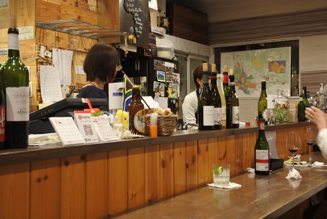 昭和の雰囲気がぷんぷんする昔ながらの町の酒屋さんの中にカウンターで南アフリカワインとワインに合うアテが頂けるお店。