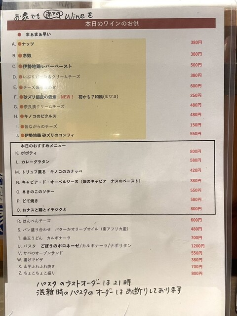 この日はきのこソテー600円をアテにして美味しいワインを頂きました。