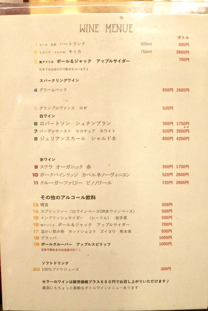 ワインの他にはビールが2種類と少々のカクテル、そして