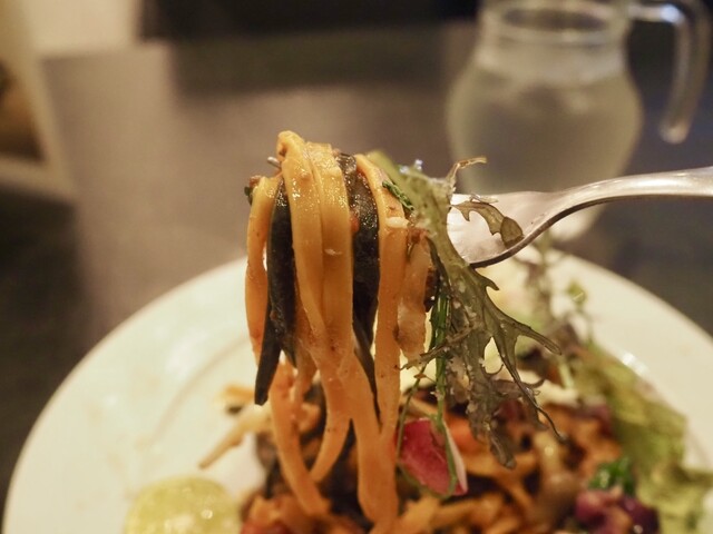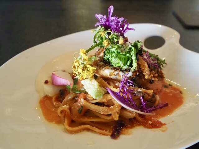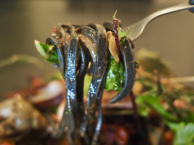 パスタはパプリカや竹炭を練り込んだタリオリーニ