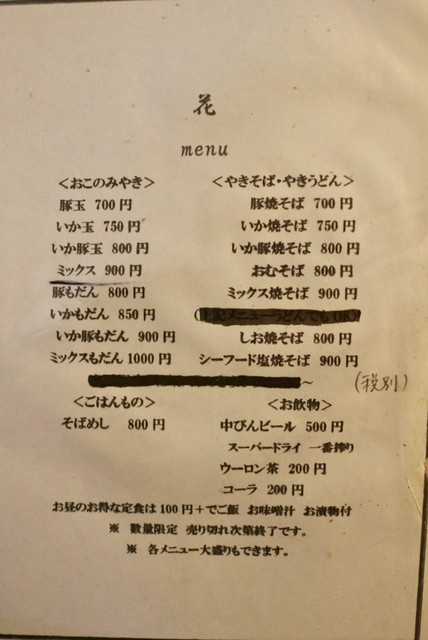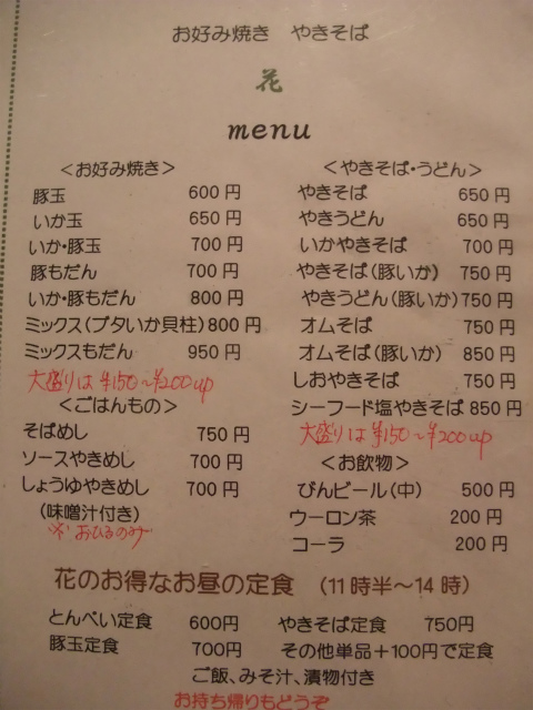 ランチメニューにはお好み焼き系8種類、焼きそば系7種類があり、これに+100円でご飯・味噌汁・香の物の