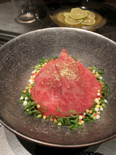 黒毛和牛ユッケ、生肉、生肉と主賓がうるさい、卵黄絡めると美味しさ倍増。
