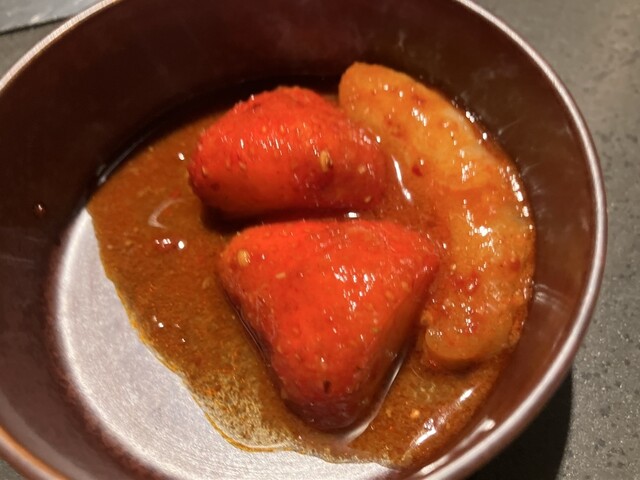 海鮮と果物のキムチ、エビといちごだった、エビはイケる。