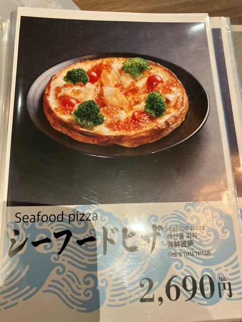 ・新メニューシーフードビザ、シャケ焼きがメイン、トマトベースのビザソース、生イクラは映え仕様でしょうね、色付けのブロッコリーにコーン、生地が厚めで旨いのでトータルでは大成功。