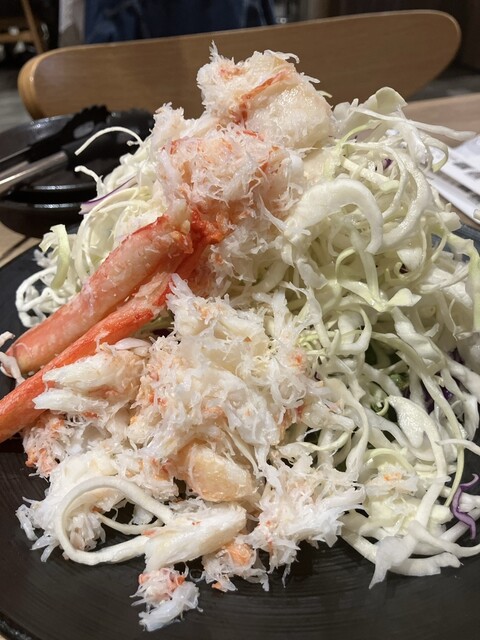 スタートはカニサラダ、キャベツたっぷり、主役のカニもたっぷり、ドレッシングが旨い。