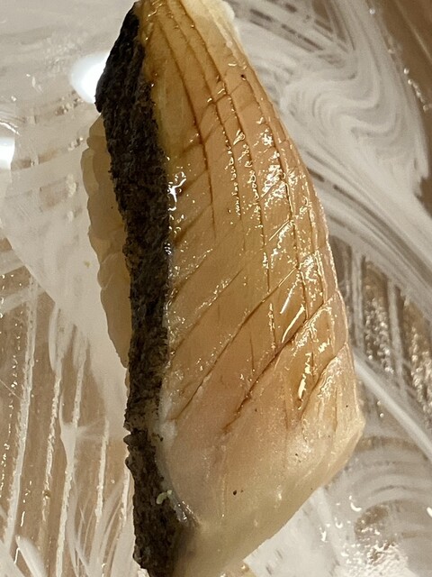イサキの昆布締め、握り前半の山場、イサキのいいのが入った、これほどのものは旬の時期でもなかなかでてこないそう、脂のってるわ、噛めば噛むほど味がでる、いつまでも噛んでいたいけどいなくなってしまった。