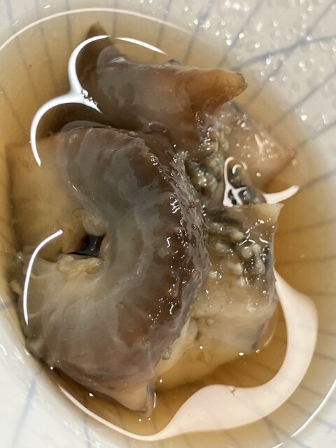 ナマコ酢、1番出汁につけた、厚めに切っているけど思ったより軟い。塩加減が重要らしい。
