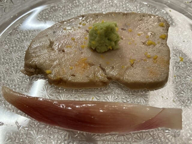 先付け、自家製カラスミと小樽の真フグ、カラスミの味を真フグが中和させる素晴らしいコラボ